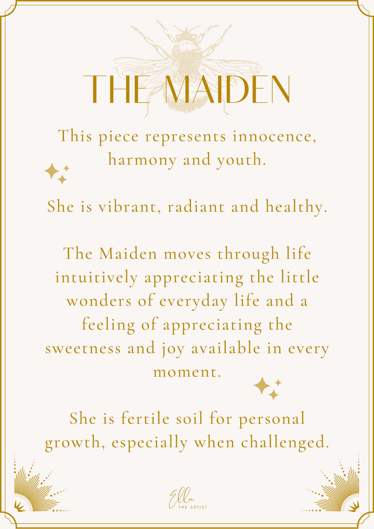The Maiden moves through life intuitively appreciating the little wonders of everyday life and a feeling of appreciating the sweetness and joy available in every moment.